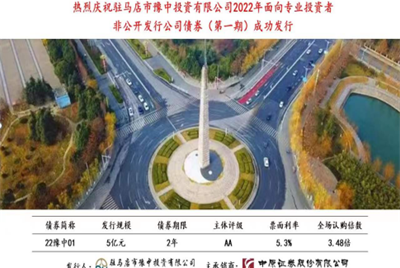 (第一期)成功發(fā)行8月30日,駐馬店市豫中投資有限公司(以下簡稱“豫中公司”)2022年第一期非公開公司債券在上海證券交易所發(fā)行成功,本次債券獲批總規(guī)模10億元,首期發(fā)行規(guī)模5億元,發(fā)行期限2年期,票面利率5.3%,認購倍數(shù)3.48倍,達17.4億元,與周邊市場相比,創(chuàng)造了發(fā)債效率高、時間短…