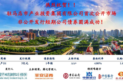 10月27日,市產(chǎn)業(yè)集團(tuán)首次在公開(kāi)市場(chǎng)非公開(kāi)發(fā)行短期公司債劵圓滿成功,發(fā)行規(guī)模5億元,期限1年,利率4.8%,主承銷商為平安證券。此次債券發(fā)行成功意味著市產(chǎn)業(yè)集團(tuán)向資本市場(chǎng)邁出了堅(jiān)實(shí)的一步,實(shí)現(xiàn)資本市場(chǎng)融資新的突破,充分說(shuō)明資本市場(chǎng)對(duì)市產(chǎn)業(yè)集團(tuán)品牌效應(yīng)和綜合實(shí)力…